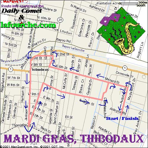 The traditional Thibodaux route, used by the Krewes of Ambrosia, Cleophas and Chronos, begins at Nicholls State University heading north on Audubon Avenue, turning west on Menard Street to East Fifth, turning north on Canal Boulevard, then west on West Second Street, proceeding west onto West First Street (La. 1), then turning south on Jackson Street (La. 20), until Canal Boulevard, when parades will turn north. The next turn is east on East Seventh Street, then turn north on Bayou Lane, then east on Menard Street and south on Audubon Ave, disbanding at its starting spot at Nicholls State University.